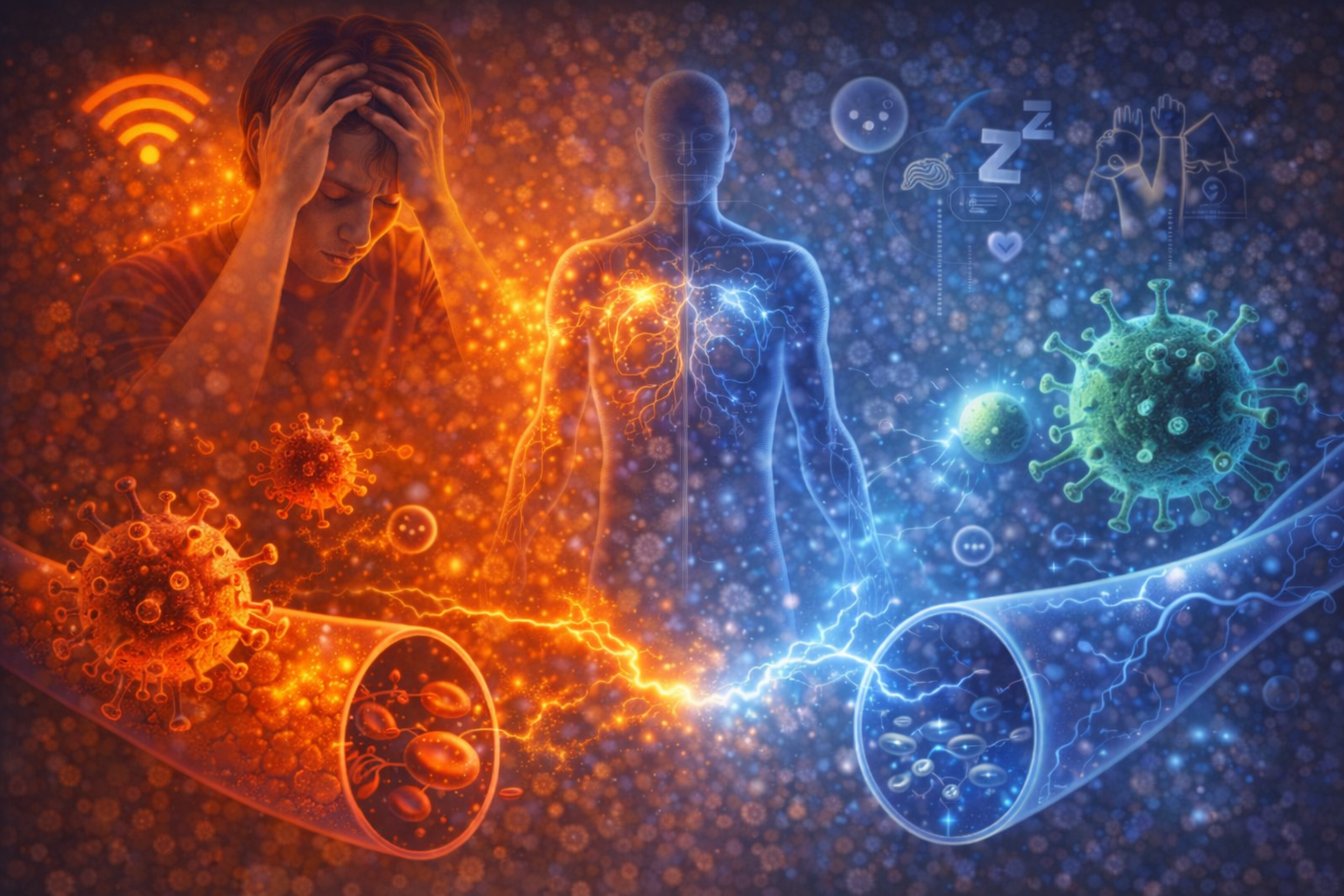 睡眠品質不佳會使免疫細胞修復時間不足;長期壓力讓副交感神經功能下降,影響免疫調節;運動不足使血液循環變慢,代謝廢物不易排出;再加上現代生活中長時間暴露於電子設備與無線環境,可能干擾細胞電位,使免疫反應出現失衡。