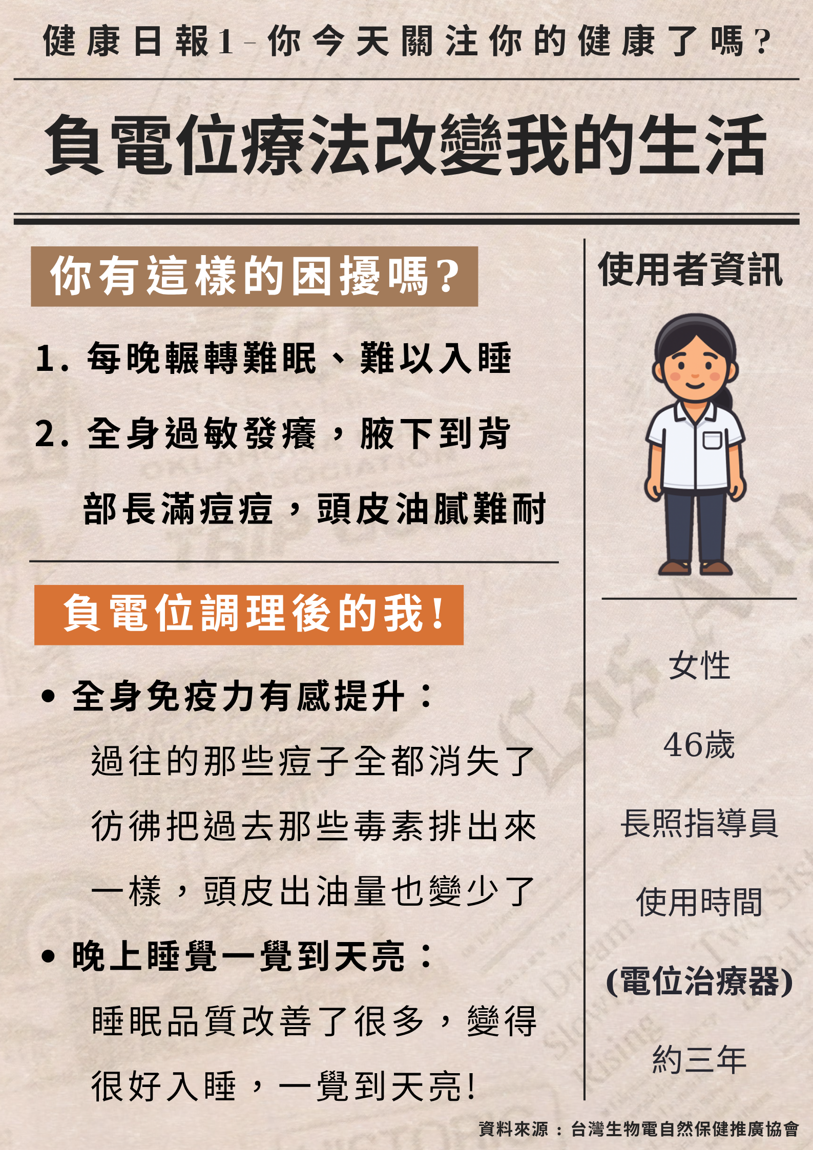 女性 46歲 長照指導員,接觸電位療法時間3年